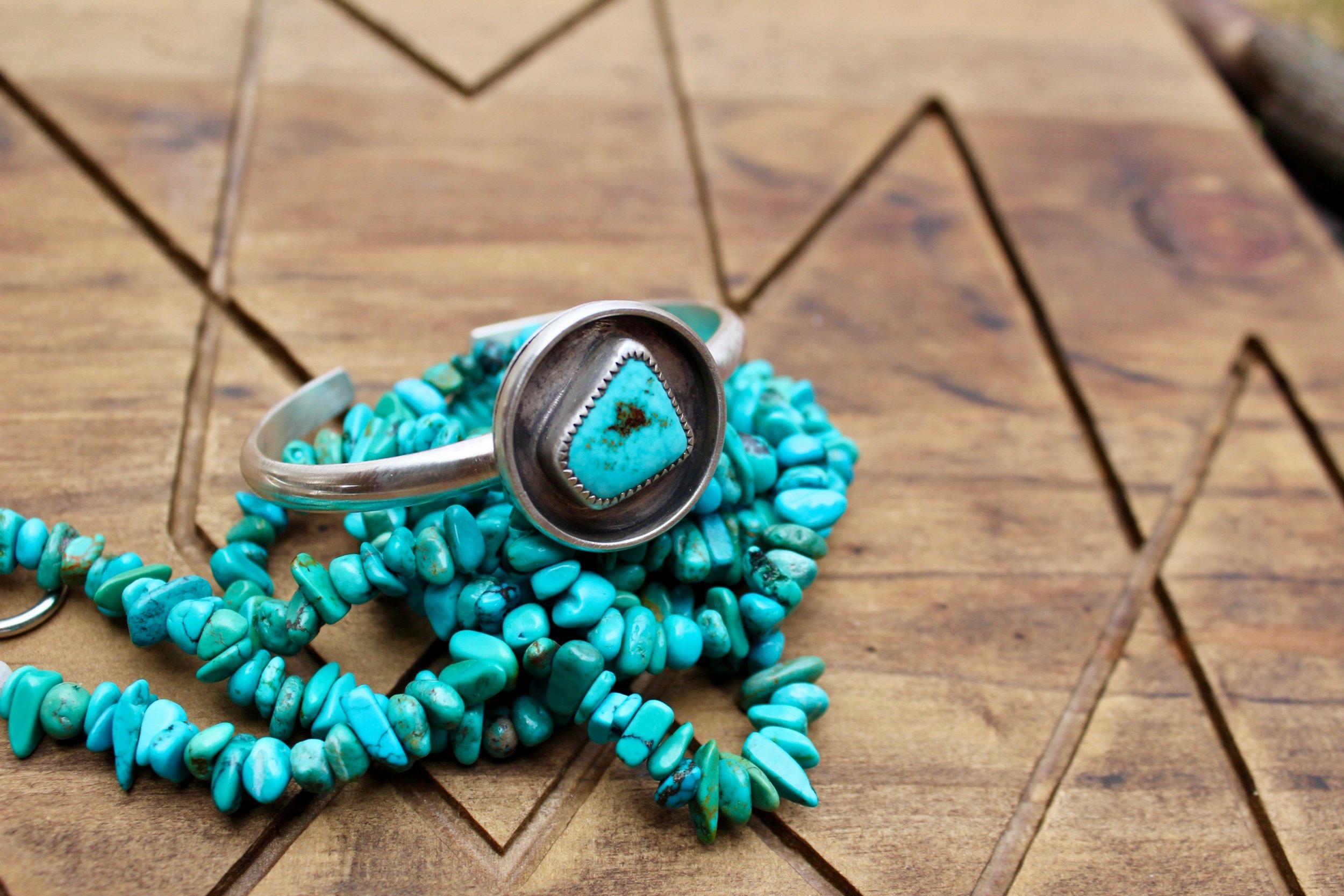Bracelets & Cuffs › Cuff Image 1 of 5 Image 2 of 5 Image 3 of 5 Image 4 of 5 Image 5 of 5 Cuff $145.00 Handmade Cuff.925 Sterling Silver Kingman Stone with Pyrite Hand-Hammered Patina Finish Add To Cart Added! Handmade Cuff.925 Sterling Silver Kingman Stone with Pyrite Hand-Hammered Patina Finish Reviews Reviewer Name Review Date Star Rating Description Posted on Etsy Product Show More