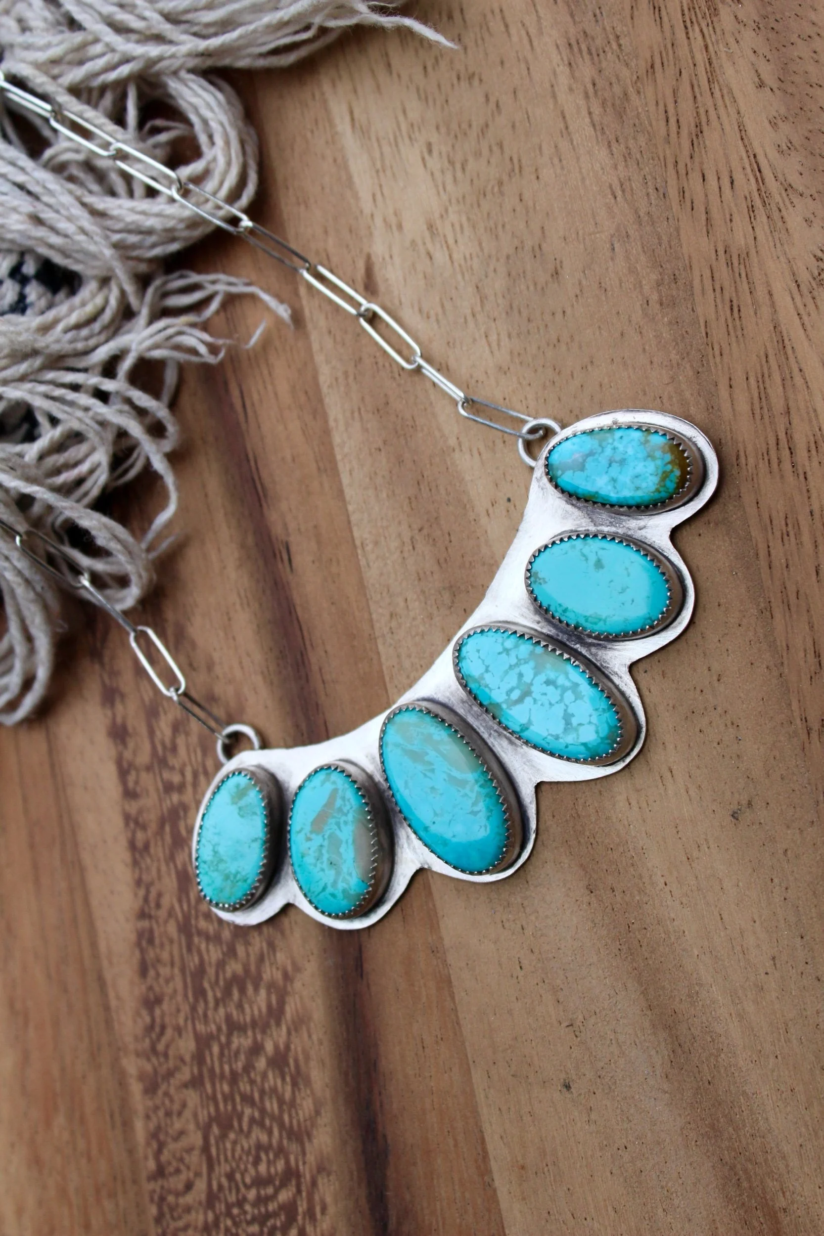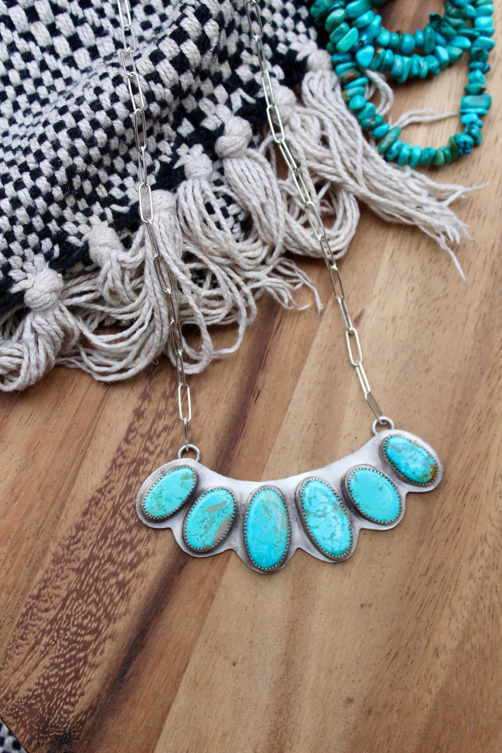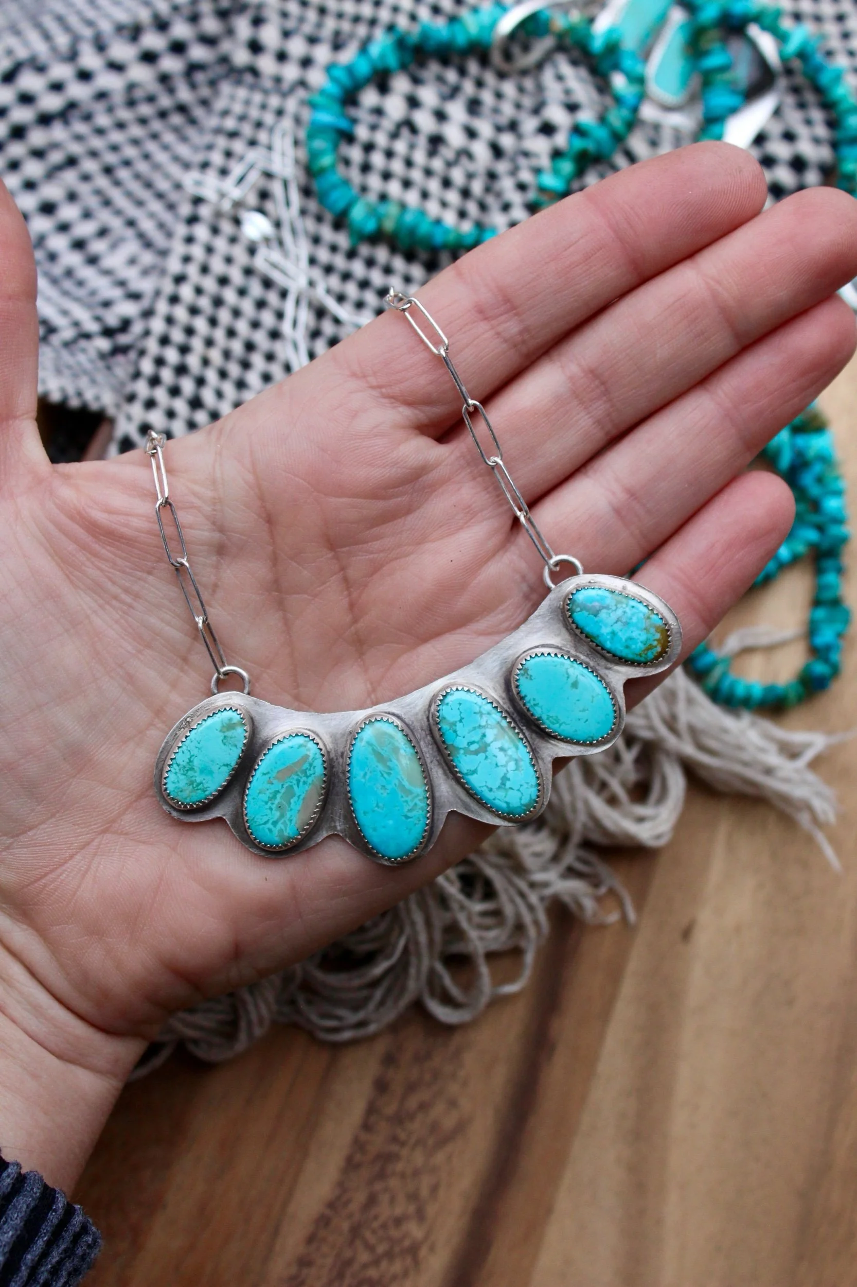Necklaces › Statement Collar Necklace Image 1 of 3 Image 2 of 3 Image 3 of 3 Statement Collar Necklace $325.00 sold out Handmade Necklace .925 Sterling Silver Kingman StonesAttached chain 22” in total length Sold Out Added! Handmade Necklace .925 Sterling Silver Kingman StonesAttached chain 22” in total length Reviews Reviewer Name Review Date Star Rating Description Posted on Etsy Product Show More