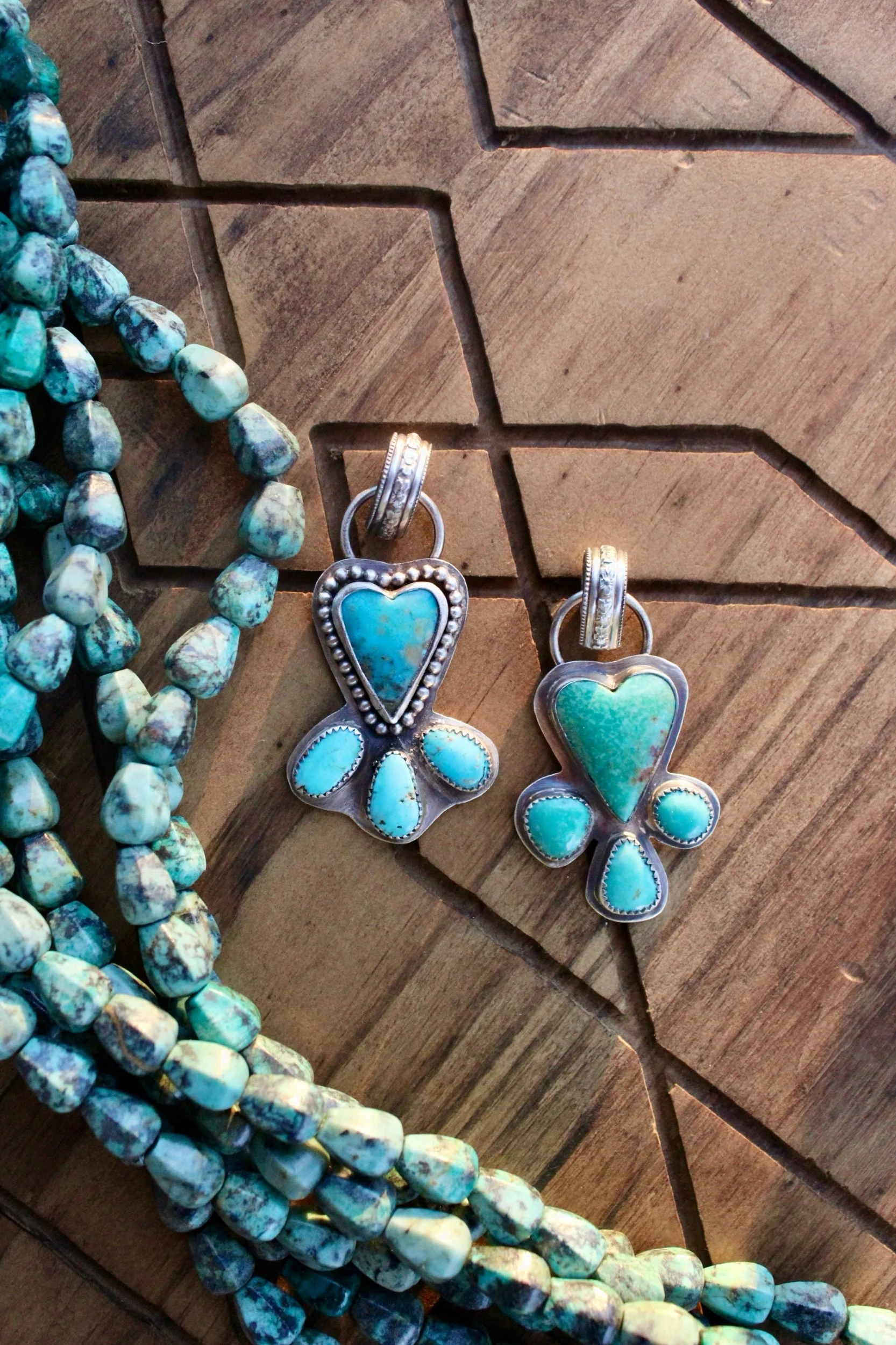 Necklaces › Heart Throb Image 1 of 9 Image 2 of 9 Image 3 of 9 Image 4 of 9 Image 5 of 9 Image 6 of 9 Image 7 of 9 Image 8 of 9 Image 9 of 9 Heart Throb $195.00 Handmade Pendant.925 Sterling Silver Kingman and Campitos StonesBeaded BorderPatina Finish Floral Bail Add To Cart Added! Handmade Pendant.925 Sterling Silver Kingman and Campitos StonesBeaded BorderPatina Finish Floral Bail Reviews Reviewer Name Review Date Star Rating Description Posted on Etsy Product Show More