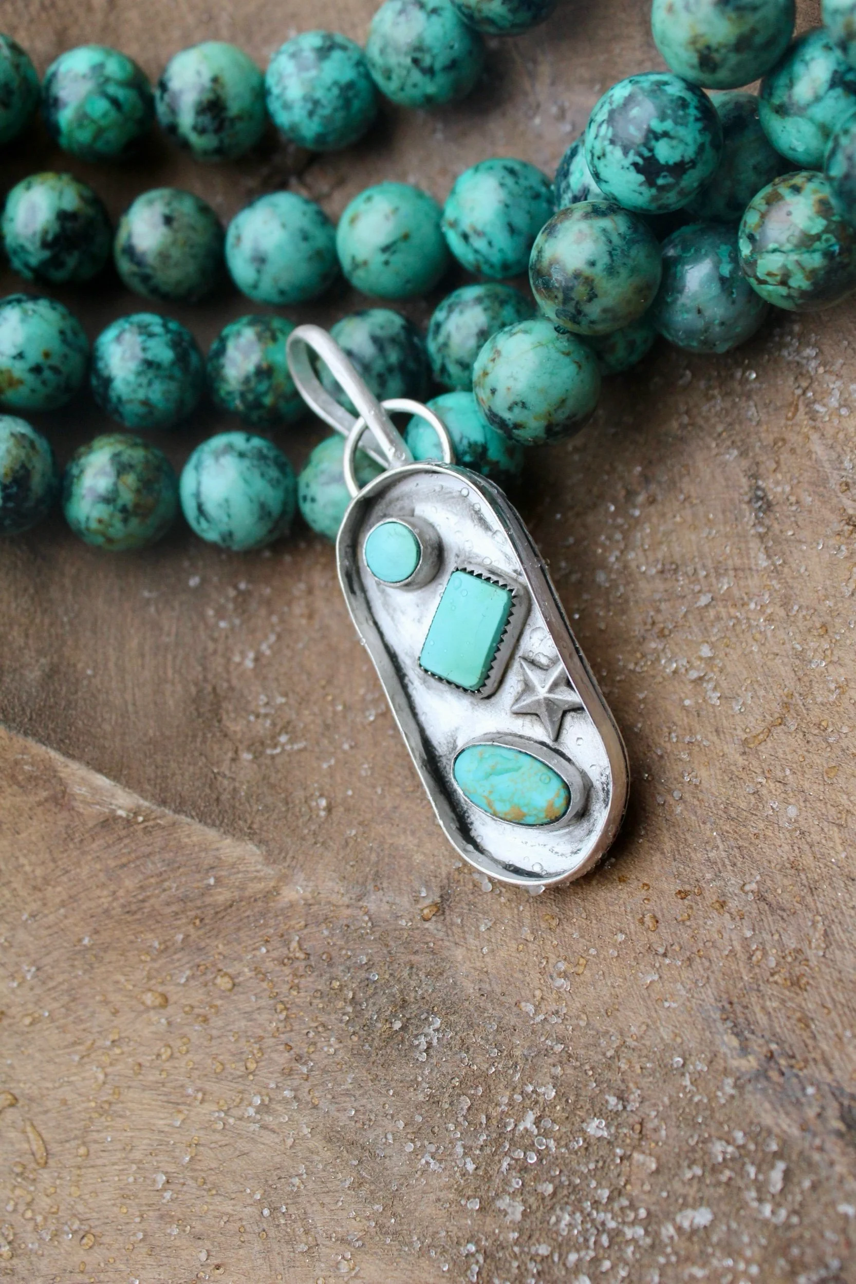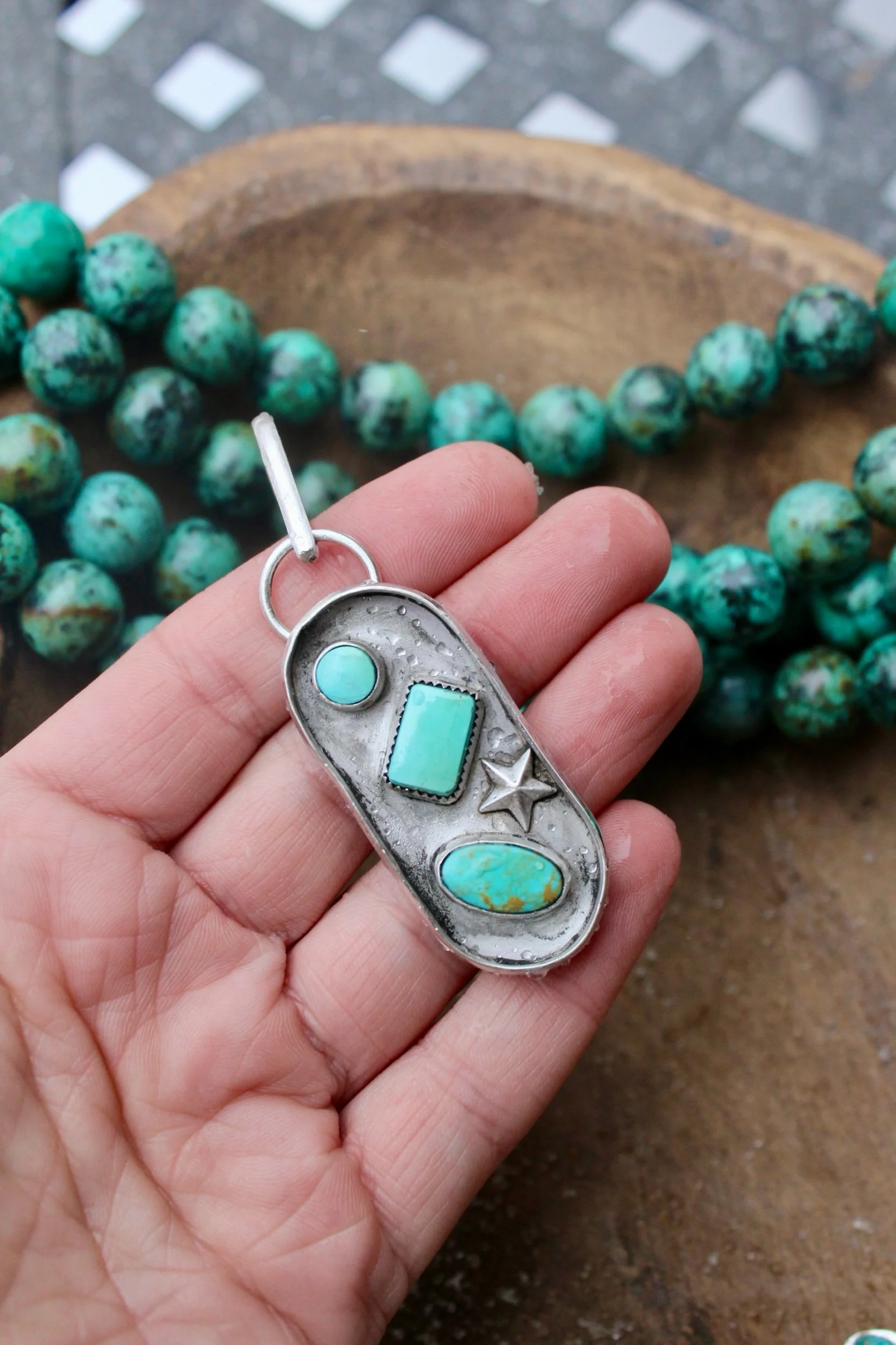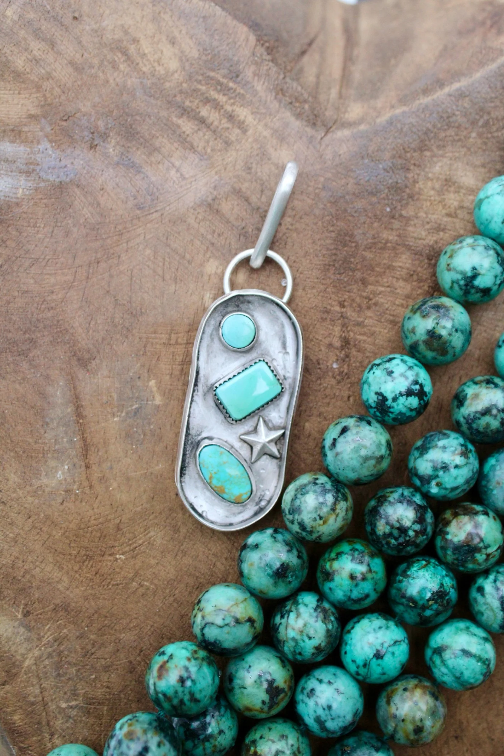 Necklaces › Payne Image 1 of 9 Image 2 of 9 Image 3 of 9 Image 4 of 9 Image 5 of 9 Image 6 of 9 Image 7 of 9 Image 8 of 9 Image 9 of 9 Payne $155.00 Handmade Pendant .925 Sterling Silver Kingman Turquoise Hand-StampedEmbellished StarPatina Finish Add To Cart Added! Handmade Pendant .925 Sterling Silver Kingman Turquoise Hand-StampedEmbellished StarPatina Finish Reviews Reviewer Name Review Date Star Rating Description Posted on Etsy Product Show More