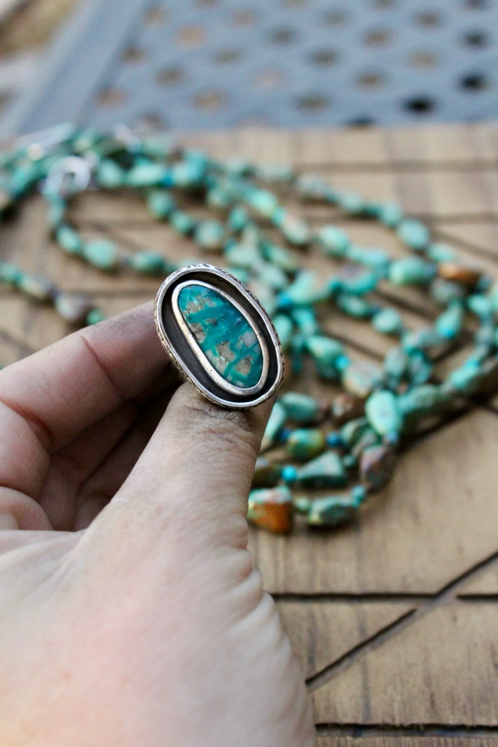 Rings › Fox Mine Image 1 of 4 Image 2 of 4 Image 3 of 4 Image 4 of 4 Fox Mine $155.00 Handmade Ring.925 Sterling SilverFox Mine Turquoise StoneFloral Border Adjustable Size Patina Finish Add To Cart Added! Handmade Ring.925 Sterling SilverFox Mine Turquoise StoneFloral Border Adjustable Size Patina Finish Reviews Reviewer Name Review Date Star Rating Description Posted on Etsy Product Show More